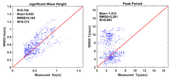The other important model forcing is the data prescribed at the open boundaries. The WWIII data used in the present modeling as the boundary condition provide relatively high accuracy for the simulated wave height and a fair accuracy for the wave peak period (https://polar.ncep.noaa.gov/waves/hindcasts/nopp-phase2.php, last accessed on 15 September 2022). However, the evaluation provided by NOAA shows that in the Gulf of Mexico, the simulation accuracy of the wave period significantly declines during the summer months. The evaluation of WWIII data at NDBC 42001, located just south of the model southern boundary, confirms this conclusion (Figure 15). The accuracy of the wave height is fair compared to the high accuracy of wave height simulation that also includes the high energy waves in different references (e.g., [9,41]). The average error (RMSE) in wave height representation is 0.16 m. However, the peak wave period does not show any correlation with measurements, while a large average error of 3.29 is calculated for the peak period. This poor peak period can significantly affect the frequency spectra of the boundary waves that eventually shift the frequencies of the simulated spectra over the shelf toward inconsistent values with observations, as shown in Figure 11. It can eventually contribute to the model underestimation of the mean period (Figure 5).