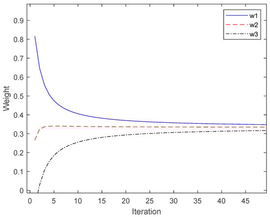 For large males, females, and small males, the inertia weight should always be . During the initial iteration of determining the global optimal value, the global exploration has a greater influence. As the number of iterations increases, the influence of local optimization increases at the later stage of the process, so the inertia weight should change as well. During the iteration process, the weight of large males should be reduced from 1.0 to 1/3. Meanwhile, female reproduction and the movement of small males following large males are examples of local search. The weight of and will be increased from 0.0 to 1/3. A control inertia weight equation is presented in this paper. The cosine function is used to describe , and the angle is limited between . For , when the number of iterations is 0, and approach 0. When the number of iterations approaches , , and weight approaches 1/3. Thus, the parameter is introduced, which is expressed mathematically as follows: