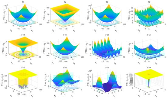 The benchmark function is a set of functions to test the performance of the evolutionary computing algorithm. The benchmark functions are described in detail by Yao Xin et al. [28]. For the purpose of testing the effectiveness, superiority, and the convergence accuracy of complex benchmark functions in high dimensions of VWCKMA, we choose 20 benchmark functions from the literature [29], including seven unimodal functions (), six multimodal functions (), and seven fixed-dimensional functions (). In addition to the global minimum, the F1 function also has d-dimension local minimum values, which are continuous, concave, and unimodal. The F9 function, called the Rastrigin function, has numerous local minima. In two-dimensional form, the F10 function is characterized by an extremely flat outer area and a large hole in the center. The introduction of the F10 function puts the optimization algorithm at risk of getting stuck in numerous local minima. The F11 function, called the Griewank function, has numerous local minima that are regularly distributed. The rescaled form of the F18 function has a mean of zero and a variance of one and also adds a tiny Gaussian error term to the output. The three kinds of function information are shown in Table 1, Table 2 and Table 3. The typical 2D versions of the benchmark functions considered in this paper are depicted in Figure 3.