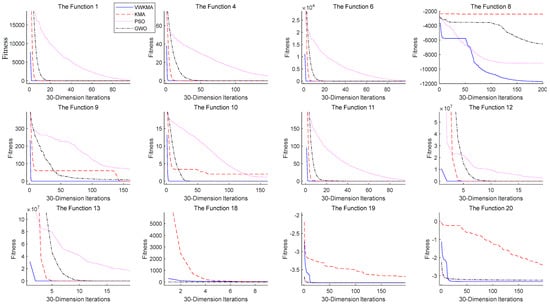 In the VWCKMA, KMA, GWO algorithms, and PSO algorithm, the maximum number of iterations is set to 200, and the maximum population size is 200. As a result, benchmark functions of 30-dimensional, 100-dimensional, 500-dimensional, and 1000-dimensional are run independently 30 times and an optimization computation is executed. The optimization solution of the fixed-dimensional functions is depicted in Table 4. As shown in Table 5, Table 6, Table 7 and Table 8, the mean and standard deviation of 7 unimodal functions and 6 multimodal functions () are calculated by different algorithms under 30 dimensions, 100 dimensions, 500 dimensions, and 1000 dimensions, respectively; the best algorithm is bold and underlined. Figure 4 depicts the convergence curves of some classic test benchmark functions in 30 dimensions to more intuitively reflect the superior performance of the VWCKMA. In order to more intuitively observe the superior performance of VWCKMA in high-dimensional situations, Figure 5 compares the convergence curves of benchmark functions of VWCKMA and other algorithms in 1000 dimensions.