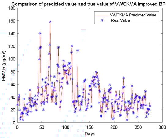 Comparison of predicted and real value of the improved BP neural network by VWCKMA.