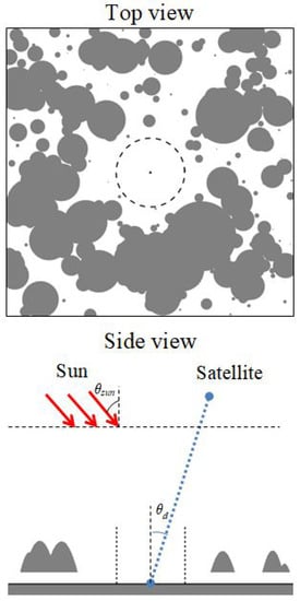 The proposed method is based on the model of radiation transfer in the stochastic cloud field [,]. Within the proposed model, we assume that the radiation is transferred in the plane “atmosphere–ground surface” system (Figure 1).