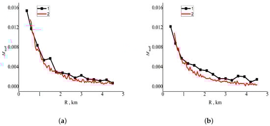 Within the mathematical model described in [], we have developed the computer program based on the Monte Carlo method. To prove the reliability of the results obtained by our program, we have compared its results with the results for the test case [], which considers the following situation: = 0.5 m, single rectangular 2 × 2 km cloud = 1 km thick, cloud base = 1 km, cloud optical depth = 20, aerosol optical depth of the cloudless atmosphere = 0.2, ground surface reflectance = 0.05, solar zenith angle = 30, solar radiation is directed along the axis Ox, zenith angle of the receiving system = . The observed points are located (a) along the axis x on the sunward side, (b) along the axis Oy. The task is to find the CAE from a single cloud on the reflectance. The results of comparison are shown in Figure 2. One can see that for the considered situations, despite the fact that our algorithm deals with paraboloid clouds, while in [] clouds are shaped as parallelepipeds, the CAE from a single cloud changes the reflectance by close values for the same distances to the cloud field: the difference between the results does not exceed 0.0026. Along with the tests reported in our papers [], this proves the reliability of the below results.