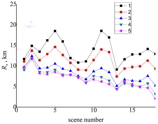 The analysis of Table 6 shows that at close to 0, the CAE radius decreases almost linearly with wavelength, other things being equal (similarly to []). In addition, for the considered images, the influence of the reflectances on the CAE radius increases with wavelength.