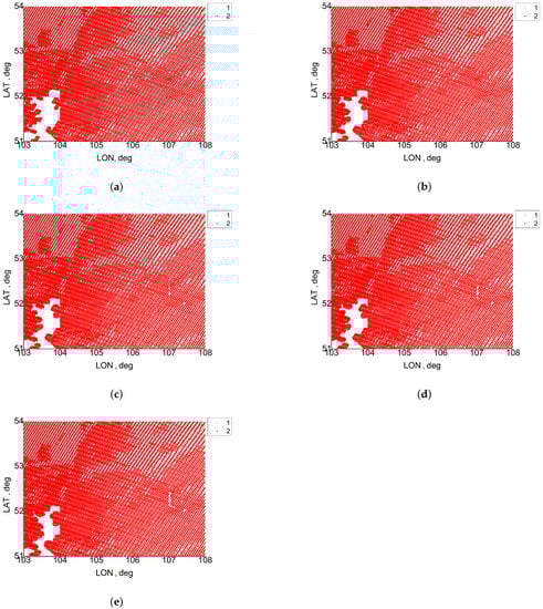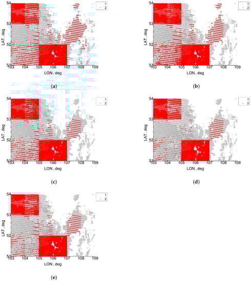 Masks of the cloud adjacency effect (CAE) on reflectance retrievals from MOIDS data for 05:00 UTC of 2 July 2021: (a) MODIS band 8, (b) MODIS band 3, (c) MODIS band 4, (d) MODIS band 1, (e) MODIS band 2; (1) cloud points, and (2) cloudless points with strong CAE.