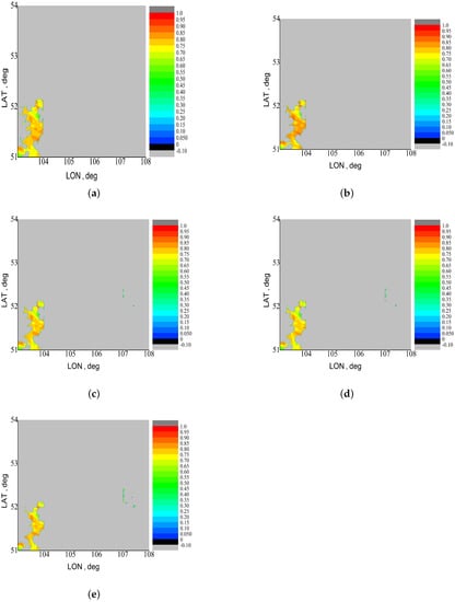 Using the obtained values of for all the considered bands and images, we have constructed the masks for pixels, in which the CAE changes the reflectance by > 0.005. Examples of the obtained masks for 05:00 UTC of 2 July 2021 and 03:40 UTC of 7 July 2021 are shown in Figure 5 and Figure 6.