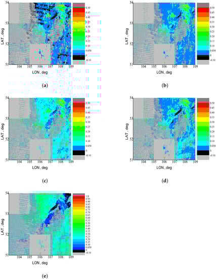 Ground surface reflectances for the considered region at 05:00 UTC of 2 July 2021, from MOD09 data after rejection of pixels with strong CAE: (a) MODIS band 8, (b) MODIS band 3, (c) MODIS band 4, (d) MODIS band 1, and (e) MODIS band 2. The values from 0 to −0.1 correspond to the negative surface reflectance according to MOD09 data. The values smaller than −0.1 correspond to areas covered by clouds or with strong CAE.