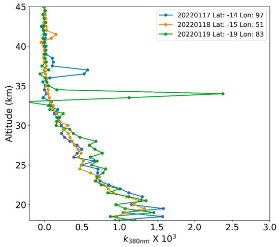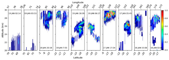 The altitude variation in the range-corrected attenuated backscatter signals of the CALIPSO lidar observations during 17 and 19 January is shown in Figure 5, Figure 6 and Figure 7. These lidar measurement captured the volcanic plume between 20 km and 30 km of altitude very well. The plume seen in Figure 7 by the CALIPSO lidar also includes the region where the plume was observed by SAGE III (Figure 4) on 19 January 2022, showing that they both detected the enhancement in signal due to the same elevated stratospheric aerosol layer caused by the HTHH eruption. The CALIPSO and SAGE III observations are also consistent with the OMI observed columnar concentration shown in Figure 1. The HTHH plume observed by the SAGE III and CALIPSO lidar matched well with the spatial and temporal expansion of the plume as observed by the OMI satellite instrument. The remaining differences in Figure 1, Figure 4, Figure 5, Figure 6, Figure 7 and Figure 8 are due to different parts of the HTHH plume being observed at different times.