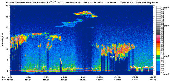 Along-track curtain of attenuated backscatter signals observed by the CALIPSO lidar on 17 January 2022 showing the volcanic plume at altitudes from 20 km to 28 km, latitudes of ~8° S to 26° S, and longitudes of 149° E to 153° E. Image obtained from https://www-calipso.larc.nasa.gov/products/lidar/browse_images/std_v4_index.php (accessed on 12 July 2022).