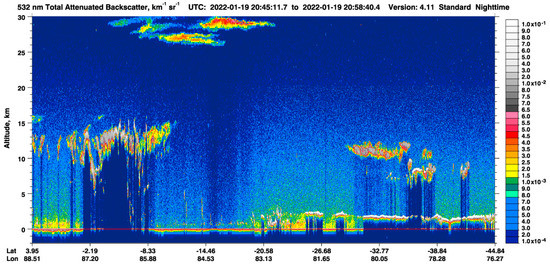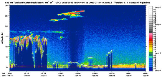 Along-track curtain of attenuated backscatter signals observed by the CALIPSO lidar on 19 January 2022 showing the volcanic plume at altitudes from 22 km to 28 km, latitudes of ~10° S to 26° S, and longitudes of 106° E to 110° E. Image obtained from https://www-calipso.larc.nasa.gov/products/lidar/browse_images/std_v4_index.php (accessed on 12 July 2022).