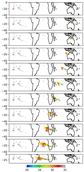 Lagrangian transport simulation of the HTHH SO2 plume dispersal in the stratosphere from 16 to 26 January 2022. The initial plume height of the simulation was set to an altitude of 28 km. The initial latitude and longitude of the trajectories were set to the location of the HTHH eruption. The simulation starting time was 04:15 UTC on 15 January 2022. The colors show the altitude of the plume in km. The topmost panel is for 00:00 UTC on 16 January 2022. The location of the HTHH volcano is marked with a red x.