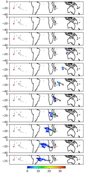 Lagrangian transport simulation of the HTHH SO2 plume dispersal in the stratosphere from 16 to 26 January 2022, showing the column density of the stratospheric SO2 in DU. The topmost panel is for 00:00 UTC on 16 January 2022. The location of the HTHH volcano is marked with a red x.