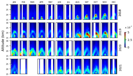 A plot of monthly mean aerosol extinction coefficients with latitude at the wavelength of 384 nm from 2017 to 2021 using the SAGE III data is shown in Figure 11. It shows that a prominent aerosol layer above 20 km was not present throughout this period. There were years when the elevated layer was present below 20 km, which might have been caused by other volcanic eruptions. It is clear from Figure 11 that a state of unperturbed background stratospheric aerosol is rare due to injections of significant amounts of SO2 directly into the stratosphere by frequent volcanic eruptions. The sulfuric acid aerosol clouds are distributed globally over a period of months and have very high optical depths compared with background stratospheric aerosols. It typically takes a few years for the stratosphere to regain its natural background [11].