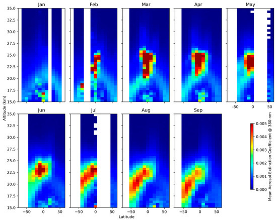 Plots of monthly mean aerosol extinction coefficients at a 384 nm wavelength at different latitudes from January 2022 to September 2022 using SAGE III observations. The x-axis of each panel corresponds to a latitude range from 50° S to 50° N.