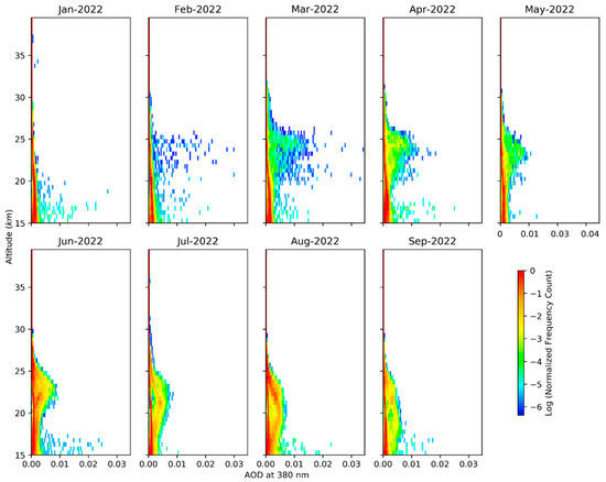 Figure 12 shows the altitude variation in the 384 nm aerosol extinction coefficients during the months following the 2022 HTHH volcanic eruption. Here we can see the overwhelming enhancement in aerosol extinction coefficients at the altitude range of 20 km to 26 km. This shows that the formation of the sulfuric acid clouds and subsequent growth in particle size caused a significant enhancement in the aerosol extinction coefficient. A histogram of aerosol extinction coefficients at 384 nm during the different months following the eruption is shown in Figure 13. This shows the dynamics of the sulfuric acid droplet growth happening at different altitudes each month. The post-eruption part of January 2022 appears to show an unperturbed state of the stratosphere, except for the occurrence of high aerosol extinction coefficient cases at the altitude of 33–40 km. With the progress of time, the occurrence of high aerosol extinction coefficient cases increased. The highest occurrences of aerosol extinction coefficient cases were observed during February 2022 and were located in the low latitude tropical belt. However, the frequency of occurrence were quite low compared with the March 2022–May 2022. The occurrences of high aerosol extinction coefficients were initially observed around an altitude of 25 km. However, after April 2022, the high aerosol extinction coefficient occurrence slowly shifted toward lower altitudes. During September 2022, high aerosol extinction coefficient occurrences were present at altitudes of 15 km to 26 km. This was due to the poleward transport of SO2 and sulfuric acid droplets and the subsequent growth in that area. At the same time, the concentration of sulfuric acid droplets reduced in the tropical region. As seen in Figure 12, the lower altitude occurrences were observed toward the poleward region and the higher altitude occurrences were observed over the tropical regions, mainly due to latitudinal variations in tropopause altitude.