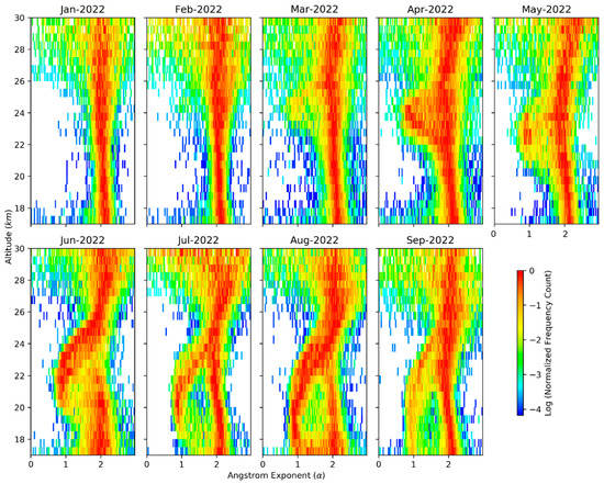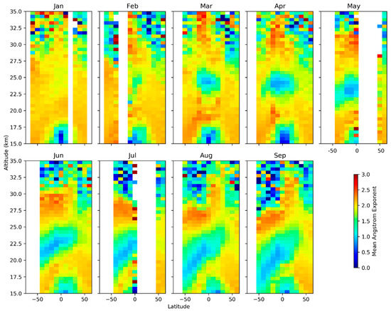 The monthly mean Ångström exponent calculated using the 520 nm and 1021 nm aerosol extinction coefficient observations by SAGE III is plotted in Figure 14, and the colored histogram corresponding to this is plotted in Figure 15. The Ångström exponent (α) at each altitude has been computed by using the aerosol extinction coefficients measured by SAGE III at 520 nm and 1021 nm wavelengths,
