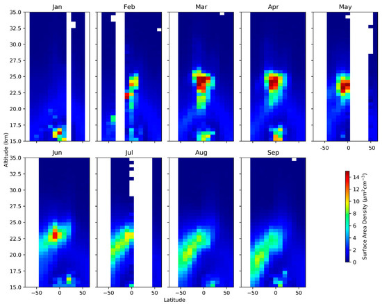A plot of monthly mean surface area density with latitude during 2022 for different months is shown in Figure 16. The mean surface area density at a ~25 km altitude reached >15 µm2cm−3 from February 2022 to May 2022. This enhancement was mainly in the tropical region. Subsequently, the surface area density increase shifted towards the poleward latitudes but it was of a comparatively lower magnitude than that which occurred over the tropical region. The histogram plot (Supplementary Figure S1) of surface area density shows that the highest surface area density occurred during the month of February, reaching more than the 50 µm2cm−3. Over the following months, the occurrences of high surface area density reduced gradually. However, the frequency of occurrence of high surface area density of sulfuric acid droplets increased until May 2022. The frequency distribution of the surface area density and aerosol extinction coefficient are similar, as the aerosol extinction coefficient is directly dependent on the surface area density of the scatterers.