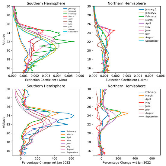 The altitude variation in the monthly mean of all SAGE III observations and the percentage enhancement in different months after the eruption with respect to January 2022 (pre-eruption) are shown in Figure 17. The peak enhancement occurred in the month of February 2022. However, the latitude–altitude extent of the sulfuric acid clouds was still limited in February. In the later months, the latitude as well as the altitude spread of the SO2 plume increased. However, peak enhancement was less than in February. The radiative impact would be much higher as it would be covering a larger latitude.