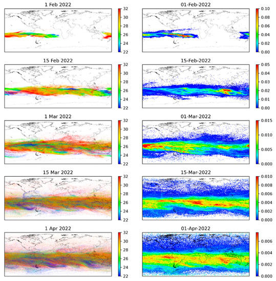 The propagation of the SO2 plume injected by the HTHH volcanic eruption on 15 January 2022 has been simulated with the MPTRAC Lagrangian transport model. This model was already used in several studies for tracking the spread of volcanic eruption plumes [52,53,54]. The MPTRAC simulation was initiated at 04:15 UTC on 15 January 2022 at 175.38° W and 28° S. The altitude distribution and the spread of the plume immediately after the eruption have been detailed by many studies using observations from satellites, such as Himawari imagery [30]. The SO2 plume was initialized at this grid box at an altitude of 28 km. The SO2 mass was fixed at 400 kt. The meteorological inputs were provided by model level ERA5 hourly data files starting from the model initiation. The simulation was carried out from 15 January 2022 to 26 January 2022.