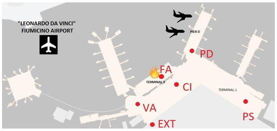 Air sampling sites at Rome–Fiumicino International Airport “Leonardo Da Vinci” (FCO) after the fire occurred on 7 May 2015 (VA = Varco Auriemma, FA = fire area, CI = check-in area, PS = police station, PD = Pier D).