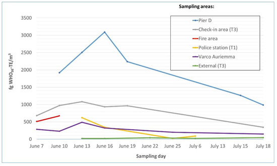 Cumulative TETOT concentrations found in samples collected at Pier D on 10, 13 and 16 June (respectively, 1916, 2503 and 3091 fg WHO98-TE/m3) show an increasing trend in contamination (Table 2, Figure 3). A downward trend is observed only starting from 19 June (Table 2, Figure 3). In the check-in area, an increase in concentration is observed in the sample of 10 June compared to the sample of 7 June (973 vs. 680 fg WHO98-TE/m3). This increase is confirmed in the samples of 13, 16 and 19 June (1083, 936, 965 fg WHO98-TE/m3). In the fire area, a moderate increase in concentration can be observed in the sample of 10 June compared to 7 June (674 vs. 512 fg WHO98-TE/m3). Samples collected at the police station in Terminal 1 halved cumulative levels starting from the second sampling (343 vs. 620 fg WHO98-TE/m3) until reaching values below 100 fg WHO98-TE/m3 in the last measurements (Table 2). Samples collected at external workstations in Terminal 3 show values below 50 fg WHO98-TE/m3 in each sampling date (Table 2). Additionally, for NDL-PCBs, the highest cumulative concentrations observed are those detected at Pier D (Table 2). At a temporal level, fluctuations in concentrations are observed at the other workstations (Table 2).