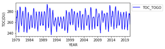 MSR-2 ozone data are built on the basis of fourteen (14) satellite data sets [30]. Positioned in polar orbit, the 14 satellites measure in the Huggins UV band (305–340 nm). The first step in data construction is to apply error bias correction to the 14 satellite datasets based on total ozone column measurements from the TOC ground-based and UV measurement stations. The correction is made according to the solar zenith angle (SZA), viewing zenith angle (VZA), effective stratospheric temperature, time, and offset (with the year 2000 as a reference). The second step is to apply the data assimilation method to satellite datasets to create global ozone data. The assimilation method is that of the sub-optimal implementation of the Kalman filter technique based on the chemistry-transport model, TM3-DAM, which gives detailed information on the transport and chemistry of ozone in the stratosphere in order to assimilate the data. The data thus constructed are the improved and extended version of MSR called MSR-2 and they are useful for studies of the TOC in places where measurement stations are lacking, such as in Africa, in particular in Togo. The spatial resolution of the data is 0.5° × 0.5° [31] and corresponds to ozone columns in the Dobson Unit (DU). MSR-2 data were chosen for this study because there is the possibility of extracting data specific to the Togolese national territory, unlike zonal data. These data have been used to study the trend of total ozone in the southern hemisphere and the Antarctic [9,28]. The data collected are monthly average values and cover 1979–2020 (Figure 1).