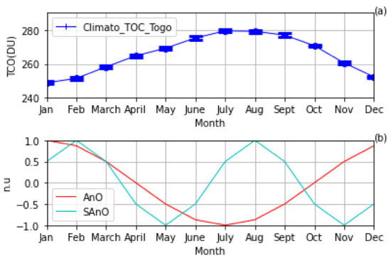 Climatology of the TOC (a) and the estimated proxies corresponding to the AnO and SAnO (Equation (1)) to simulate the climatology of the TOC (b) in the DU above Togo. The TOC is in the DU while the AnO and SAnO are in non-units (n.u).