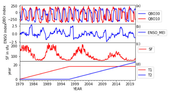 The Quasi-biennial Oscillation at 30 mb (QBO30) and 10 mb (QBO10) index (a), multivariate ENSO index version 2 (b), the Solar Flux (SF) index at a 10.7 cm wavelength in the SFU (Solar Flux Unit) with (c), and trend functions T1 and T2 (see Equation (3)) as a function of the year (d).