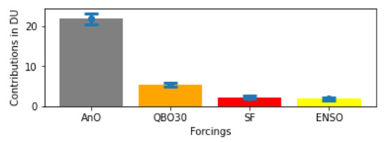 In absolute value, according to Table 3 and Figure 4, the strongest significant contribution is given by the AnO (21.84 ± 1.42 DU), as expected, while the smallest is given by the SAnO (0.84 ± 1.42 DU). In fact, the AnO characterizes the mechanism reflecting the seasonal variations of weather and climate. The contribution of the AnO is followed by that of the QBO30. After the QBO30, the forcing that controls the variability of the TOC is the SF. The ENSO contribution follows that of the Solar Flux.