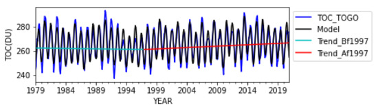 Thus, according to the model, the TOC has a statistically insignificant negative trend before 1997 above Togo. The decrease is a weak value of 0.3% ± 0.9% per decade (2σ). After 1997, the trend is positive and statistically significant. The rate of increase is 0.6% ± 0.2% per decade (2σ). This trend of close to 1% is different from that obtained in the report of the World Meteorological Organization (WMO) in 2018 [16], which reports that the trends of ozone in the tropical band are almost zero during the period of 1997–2016. This difference of 0.6% could be due to the spatial coverage because this study is limited between 6° N and 11° N, while for the WMO it is a larger region between 20° S and 20° N. Another hypothesis could be related to the temporal coverage of the data used because the time series of the study covered a shorter period. The trend obtained is close to that obtained by Weber et al. [25] from the merged GSG and GTO dataset, where the trend is estimated at 0.3% ± 0.3% per decade after 1995 in the tropics at latitudes between 20° and 20° S. It is different from the trends close to zero obtained in the tropics at latitudes between 20° and 20° S after 1995; by the same authors from NASA, NOAA, and WOUDC, who merged the data.