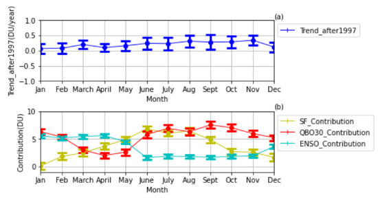 The trend in the variability of ozone per month (2σ) in Togo after 1997 (a), the seasonal contribution of the forcings (b).