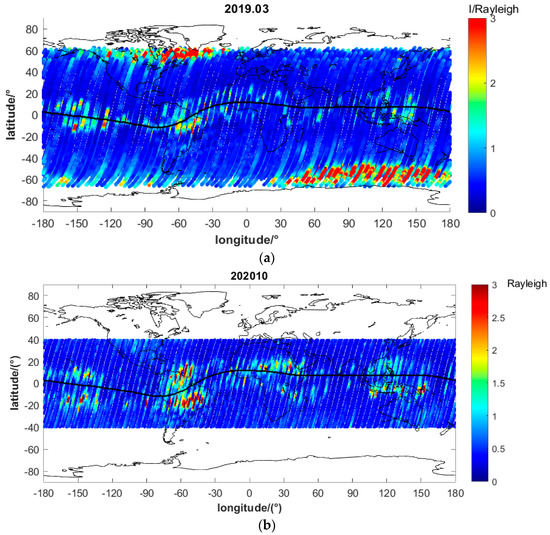The FY-3(D) IPM nighttime data used in this paper are in the geomagnetic quiet period. We added all the 8 Kp values per day to obtain ∑Kp if ∑Kp < 20 and every Kp < 5.; these data were used for the geomagnetic quiet period. The distribution of the OI135.6 nm radiation intensity at 02:00 LT in the geomagnetic quiet period was obtained using data from March 2019, as shown in Figure 1: