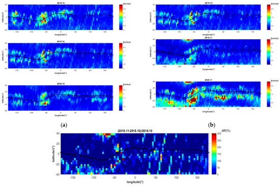 The region of −180°to 180° longitude and −40° to 40° latitude was divided into a grid of 4 × 4°. Then, the FY-3(D) IPM data in the geomagnetic quiet period from October to November 2018, 2019, and 2020 were averaged in the grid separately. We obtained the distribution map of the OI135.6 nm radiation intensity in the grid for corresponding months. Figure 3a shows the intensity in October from 2018 to 2020. Figure 3b shows the intensity in November from 2018 to 2020. The high intensity at 40° N and 70° W, as shown in Figure 3b, is due to the influence of the aurora edge. Figure 3c shows the relative rate of the change in intensity, which is obtained from the following formula: