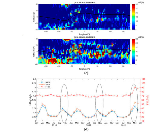 Figure 3c shows that, within the EIA structure, the OI135.6 nm radiation intensity in November 2018 and 2019 has a relative increase and decrease. However, in November 2020, the OI135.6 nm radiant intensity increased with a relative change rate of about 100–200%. The relative change rate of the OI135.6 nm radiation intensity in November 2020 was significantly enhanced compared with November 2018 and 2019.