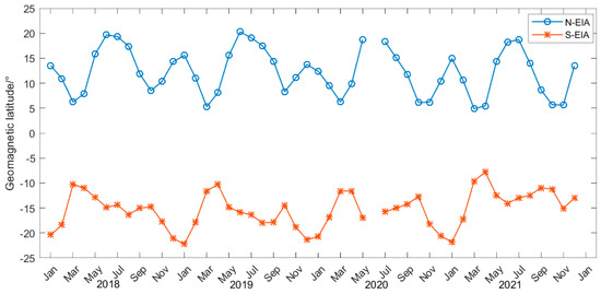 Some studies found that the latitudes of the EIA crest moved poleward with the enhancement of the solar activity [41,42,43]. However, no study focuses on the monthly variation of the at the same local time after midnight. Figure 5 shows the monthly variation in both the northern and southern hemisphere from 2018 to 2021.