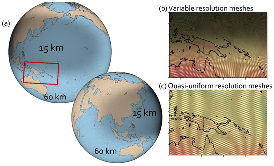 (a) 60–15 km variable resolution meshes of MPAS on a globe and meshes over a transient area (marked by the red box in (a)) (b) with variable resolution and (c) without variable resolution (i.e., quasi-uniform resolution).