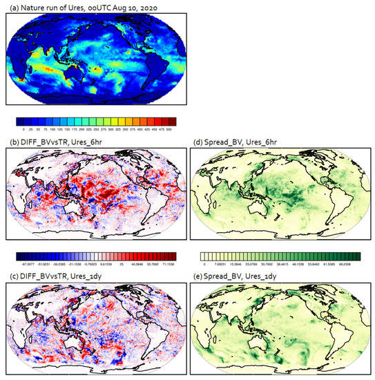 We first evaluated our breeding cycle systems to examine whether a spread of the ensemble forecast within the breeding cycle well represented forecast uncertainty. Figure 2 and Figure 3 show the instantaneous fields of surface latent heat flux from Ures and Vres, respectively. Here, we computed the difference between the mean of the ensemble forecast starting from the rescaled bred vectors at the previous cycles and the nature (Figure 2b,c and Figure 3b,c), which gave the actual error of the ensemble forecast. Then, we compared those differences with the spread of ensemble forecasting to see whether bred vectors worked well for good ensemble forecasting. We needed to confirm if spreads of the ensemble forecast starting from the bred vectors captured actual dominant errors well or not. Here, the spread was defined as a standard deviation of 20 ensemble forecasts. We analyzed the major variables of the model and only show some of them here because the results were consistent across variables.