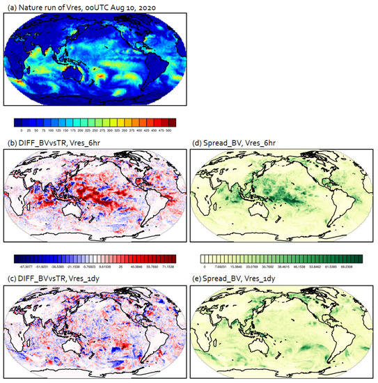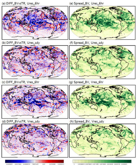 From Figure 2 and Figure 3, we can see that the most outstanding contrast was in the difference in results for different rescaling scales. The BVs from the 6-h rescaling interval (Figure 2b,d and Figure 3b,d) highlighted forecast uncertainty that is dependent on the convective scales over the tropics while the BVs from the 1-day rescaling interval (Figure 2c,e and Figure 3c,e) highlighted forecast uncertainty depending on the synoptic scales over midlatitudes. Therefore, we confirm that the longer rescaling interval saturated the small-scale error growth, thus allowing the temporally longer and spatially bigger scales to be isolated. Even though we did not adjust the size of initial perturbations, we could obtain those obvious effects in the scales of dominant errors. This tendency is consistently found in other variables.