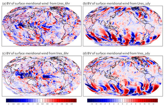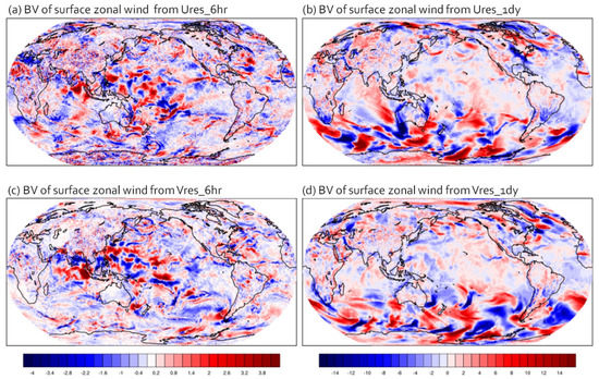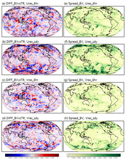 In addition to analyzing the instantaneous fields of the ensemble forecasting starting from bred vectors, we examined their time-averaged fields for the variable of mid-level specific humidity and surface zonal/meridional wind (Figure 6, Figure 7 and Figure 8). Since bred vectors captured the flow-dependent and fast-growing errors, both Ures and Vres showed forecast uncertainty where the convective instability and/or midlatitude synoptic instability occurred. However, Vres tended to reduce noisy pattern of errors overall. The errors from Vres_6hr seemed to be especially suppressed around mesh transient regions such as Iran, Kazakhstan, California, and Northern Australia (Figure 1a). This is an interesting occurrence that we consistently found in the results from the three different variables of Figure 6, Figure 7 and Figure 8. The fact that intrinsic predictability looked encouraging over those mesh transient regions may be another interesting topic to explore when investigating practical predictability in future studies.