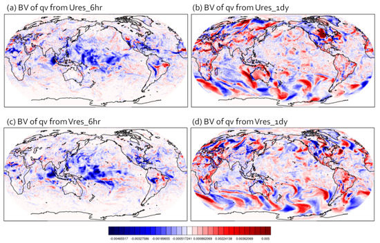 Time−averaged difference of specific humidity (kg/kg) near the 850 hPa model level, between mean BVs and the nature, from (a) Ures_6hr, (b) Ures_1dy, (c) Vres_6hr, and (d) Vres_1dy.