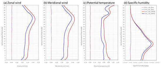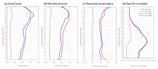 Vertical profile of averaged RMS difference (solid lines) and bias (dashed lines) between the mean BV and the nature of (a) zonal wind, (b) meridional wind, (c) potential temperature, and (d) specific humidity. Here, red lines indicate results from Ures_6hr and blue lines indicate results from Vres_6hr.