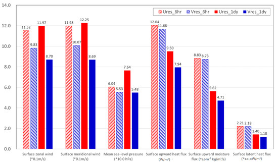 We also computed the horizonal average of RMSE and BIAS of surface two-dimensional variables that are essential for marine weather prediction (Figure 11). Every variable of the surface wind, mean sea-level pressure, surface heat/moisture flux, and latent heat flux showed a lower magnitude of errors in Vres than in Ures for both the 6-h and 1-day forecast lead time. There were some variations among the variables, but we could see that the improvement of Vres tended to be greater with the 1-day rescaling interval than with the 6-h rescaling interval. Some variables such as the mean sea-level pressure, surface fluxes of upward heat, upward moisture, and latent heat showed a minor improvement of Vres with a 6-h short-term forecast while surface wind variables showed significant improvement of Vres for both 6-h and 1-day rescaling intervals. As far as we could verify, none of the variables at the surface gave worse results for Vres than Ures.