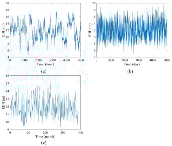 Three datasets of the EDH time series with different timescale:s (a) hourly, (b) daily, and (c) monthly.