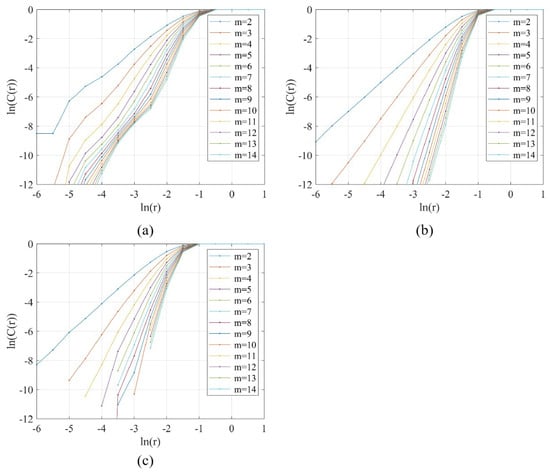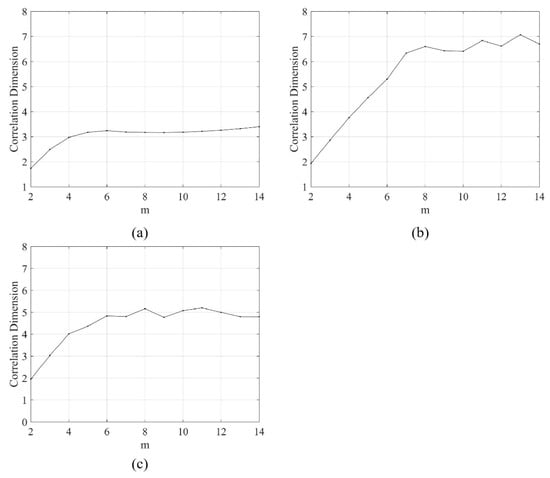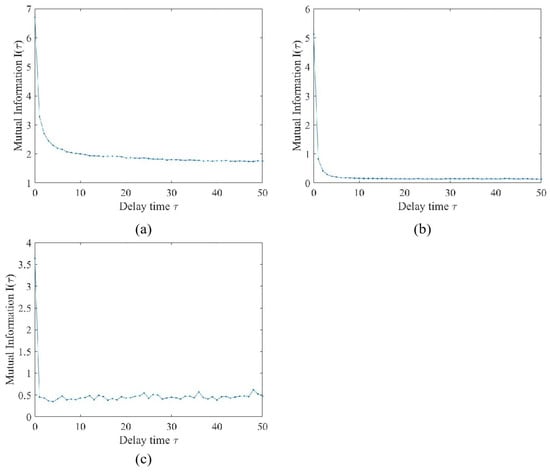 A small delay time will result in little new information contained in each of the subsequent data, which leads to an underestimation of the correlation dimension [59]. In contrast, if is too large, all information for phase space reconstruction is lost because neighboring trajectories diverge and averaging is no longer useful. This may lead to an overestimation of the correlation [60]. In this study, the delay time was determined by the mutual information method [61]. The mutual information method makes use of Shannon’s comentropy theory to calculate the correlation between two variables and measure their overall dependence at the same time. Considering time series and , the mutual information is