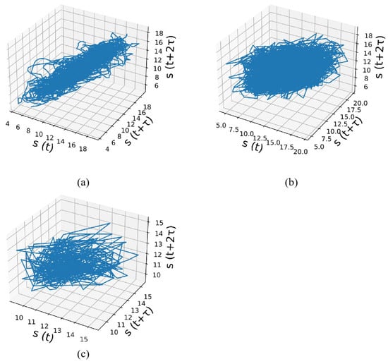 The three-dimensional phase space of the reconstructed EDH time series at three different timescales: (a) hourly, (b) daily, and (c) monthly.