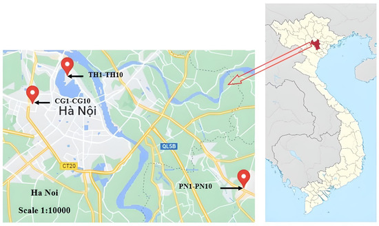 Thirty fine particulate matter air samples were collected at 3 locations in Hanoi in January 2021 (dry season) (Figure 1). At each location, 10 samples were collected, representing 10 consecutive days. Samples were collected for 10 h from 8 a.m. to 6 p.m. Samples were coded in order of collection and sampling location. Samples PN1–PN10 were collected at one location (20°57′04.6″ N, 106°01′24.3″ E), i.e., Pho Noi (PN) industrial zone, approximately 24 km from the center of Hanoi. TH1–TH10 (21°03′57.9″ N, 105°49′22.1″ E) were collected in Quang Ba ward, Tay Ho (TH) District, where numerous agricultural activities occur, including a large flower market. Samples CG1-CG10 (21°02′12.0″ N, 105°47′01.6″ E) were collected in Cau Giay (CG) District, an urban district of the city with excessive traffic and population density. A high-volume air sampler (Shibata HV-500R, Japan) with cutoff PM2.5 was used for sample collection at an average flow rate of 6 m3/h [20]. The quartz fiber filters was baked at 550 °C for 6h and then stored in a desiccator (48h at a temperature of 25 ± 2 °C and relative humidity of 50 ± 4%) before use. The filters were weighed before and after sampling under the same conditions. After weighting, each filter was wrapped in aluminum foil, kept in a polypropylene bag, and stored at −20 °C until extraction.
