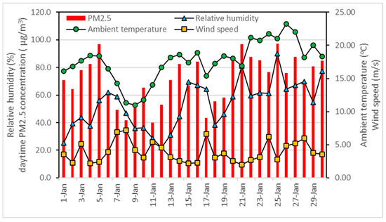In this study, we collected Hanoi weather data during the sample period from the Weather Underground website (https://www.wunderground.com accessed on 1 February 2021) for Noi Bai airport, which is located approximately 30 km from the sampling location. Hourly data collected for the study site in January 2021 include temperature, humidity, and wind speed. Pooled data for this study were averaged from the data collected during the sampling period from 8 a.m. to 6 p.m. The average results for the day were used to assess the relationship between PM2.5 levels and climatic factors (Table S3).
