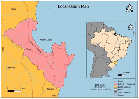 This study was conducted at Balneário Camboriú, which is located in the Southern Brazilian state of Santa Catarina and is part of the Subtropical Climate (Cfa) that runs in the state’s coastal communities []. Its latitude and longitude are 26°59′42′′ S and 48°37′46′′ W, respectively. The Balneário Camboriú is situated on the northern shore of Santa Catarina, bordering the towns of Itajaí, Itapema, and Camboriú (Figure 1).
