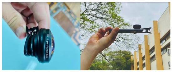 For the SVF computations, using the RayMan PRO 2010 Free software (Freiburg, Germany) [], we employed a 218° fisheye lens connected to the camera of a cell phone (Figure 3) [,,,,,,,]. The places chosen for the removal of pictures varied on the basis of the results obtained from the transects’ change of environment zones (LCZs) [].