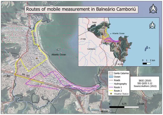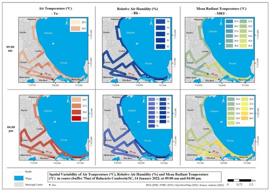 The times selected for the mobile measurements were at 9:00 a.m. and 4:00 p.m.; these times were defined because they have different influence on environmental variables, mainly as a function of Sr [,].